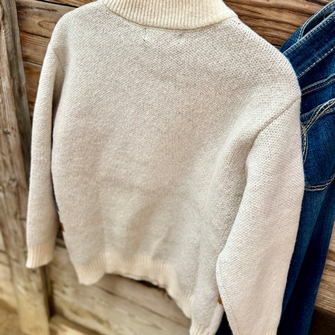 The classic Aztec pattern gives it a timeless Western look, while the relaxed, slouchy fit delivers that lived-in “grandpa sweater” feel we all love. Soft, warm, and effortless, this piece works just as well for chilly mornings at the ranch as it does for running town errands.