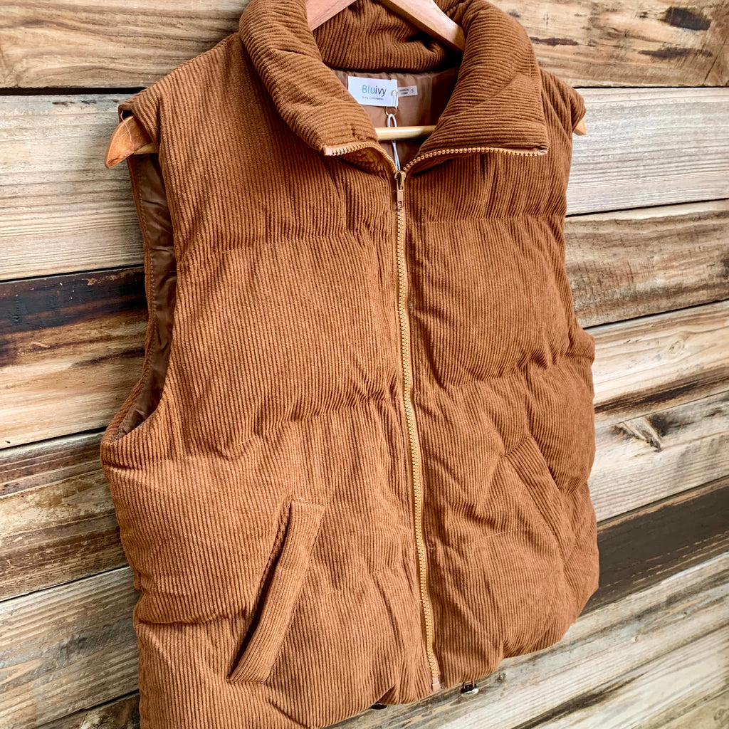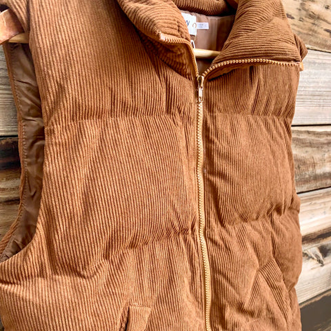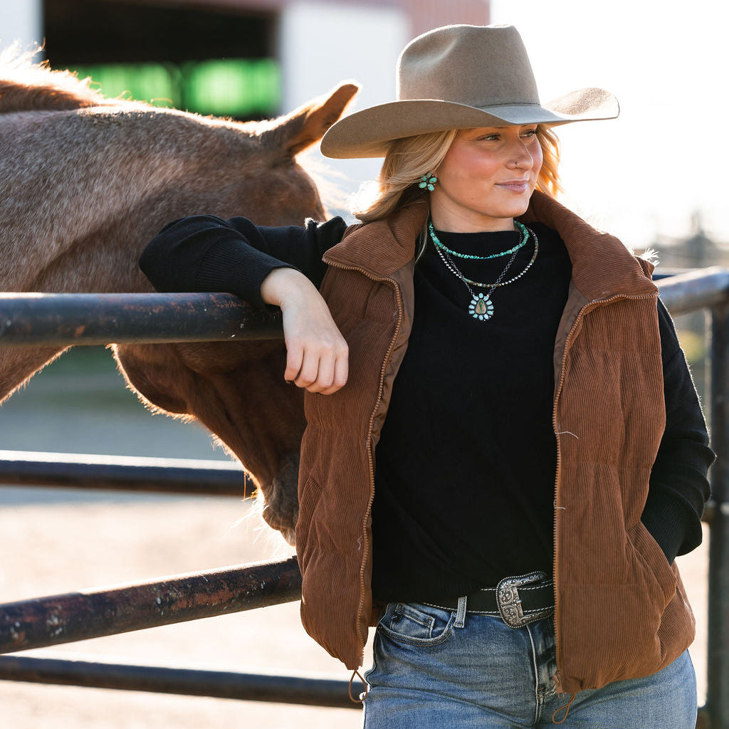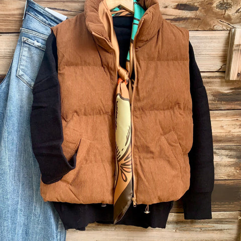 This camel corduroy puffer vest is your go-to layer for staying warm and looking sharp. The soft, touchable exterior pairs beautifully with sweaters. Throw on a western necklace or wild rag to complete your signature look. Designed true to size which is perfect for anyone who values both comfort and Western-inspired style, this vest transitions seamlessly from casual outings to dressed-up occasions.