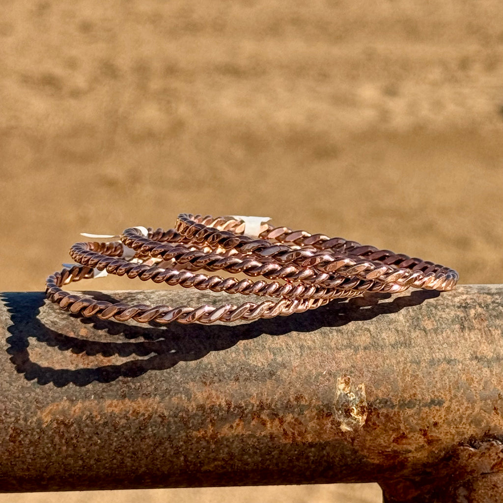 Warm, earthy, and western, these solid copper bangles are the perfect everyday statement. Designed to stack or wear alone, they add a rich, natural tone that pairs beautifully with turquoise, silver, and your favorite wild rags. Lightweight yet durable, they develop a unique patina over time, giving each piece its own character. Whether you’re dressing up for a live sale night or keeping it casual at the barn, these bangles bring that timeless ranch-style finish to any look.
