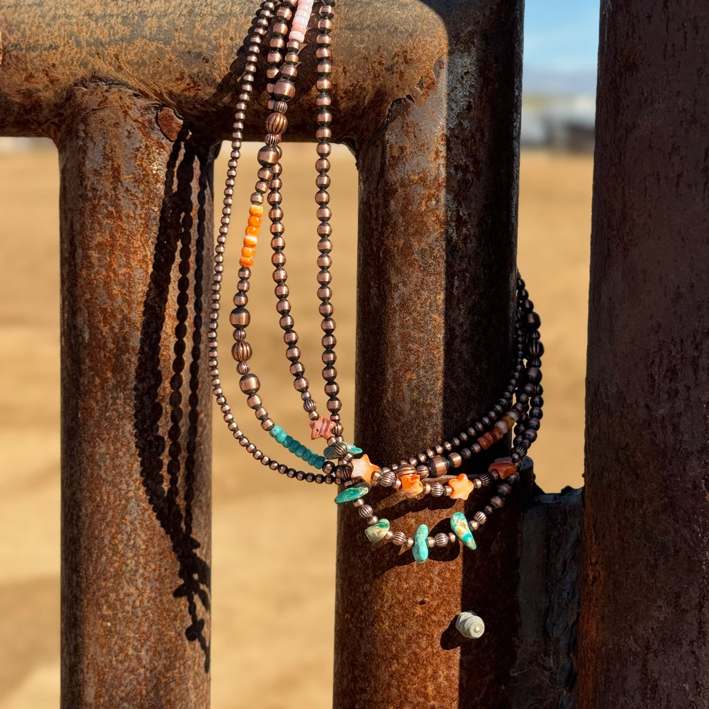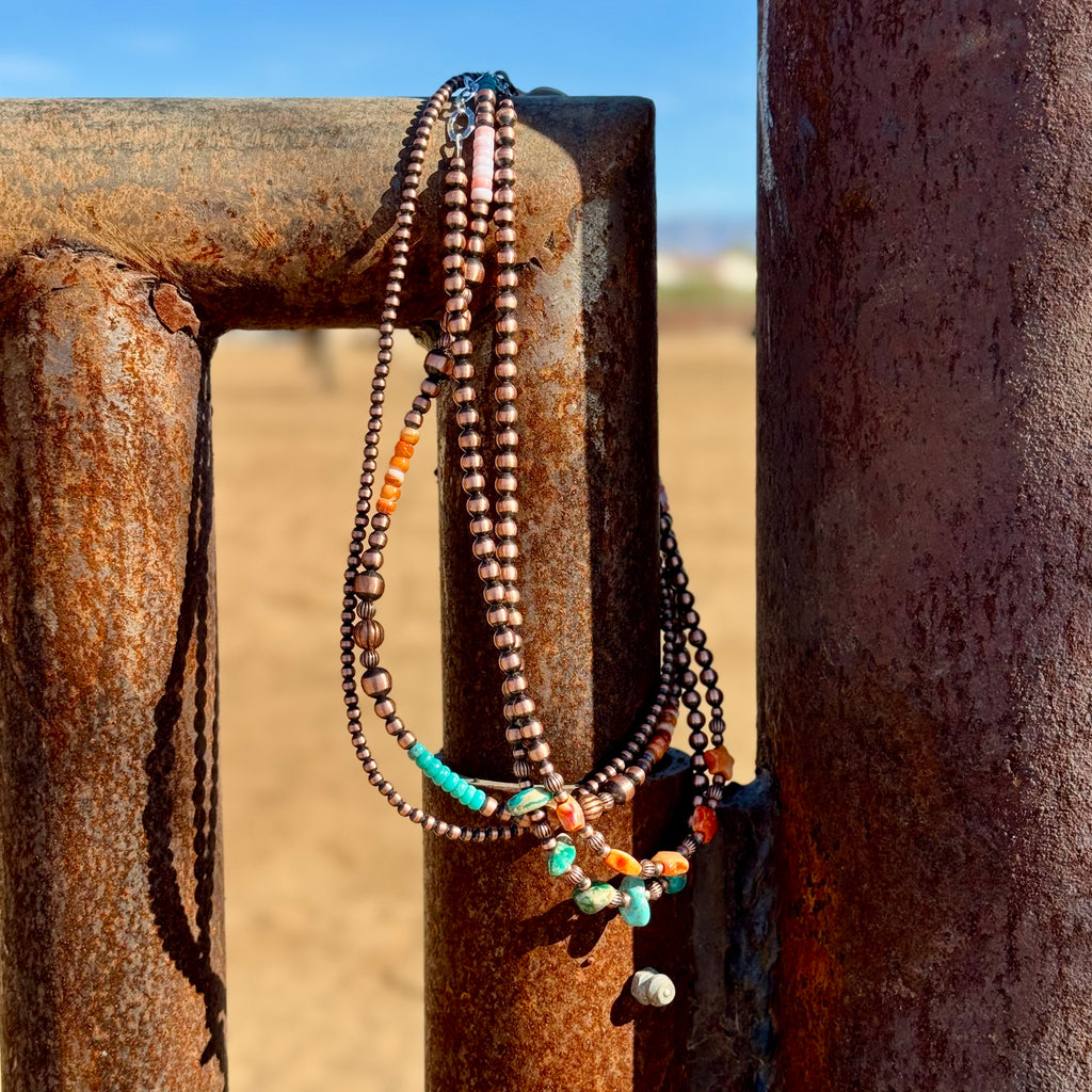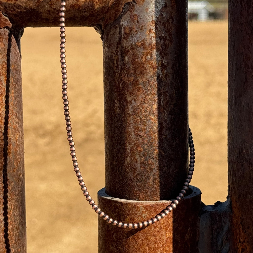 These copper necklaces bring a bold yet classic western feel with their rich, warm tone and simple, wearable design. Each necklace measures 14” with a 2” extender, allowing you to layer it easily with other pieces or wear it as a close-fitting statement on its own. Perfect paired with turquoise pendants, Navajo pearls, or styled under a wild rag, this piece adds depth and warmth to any outfit while staying comfortable for everyday wear.