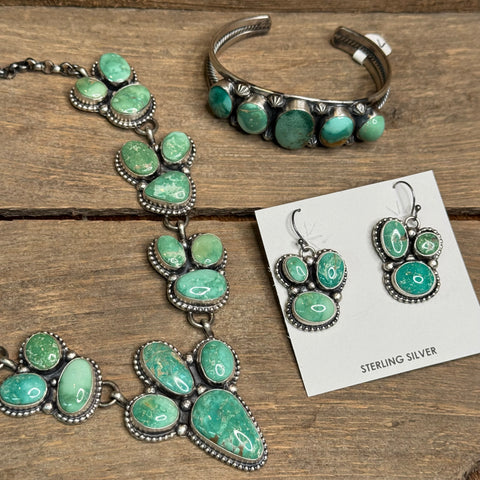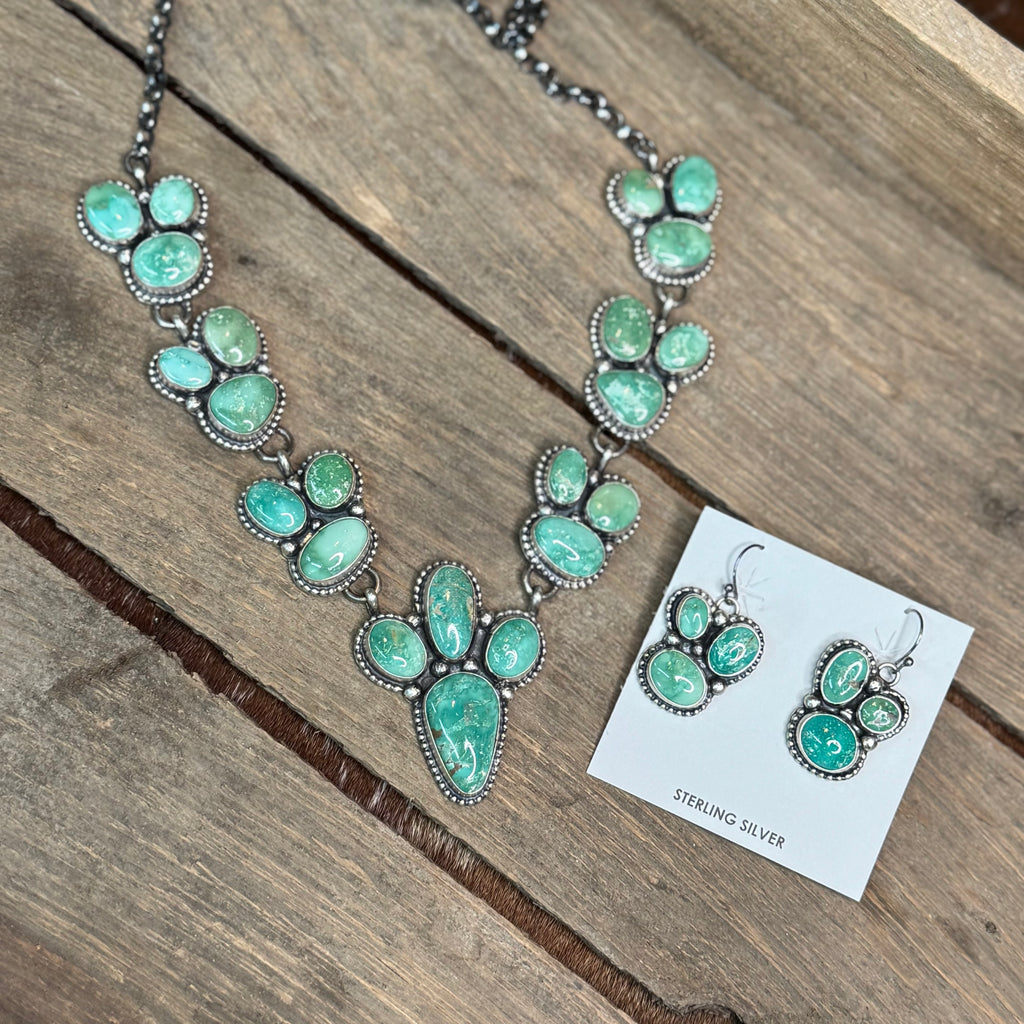 18" Emerald Valley Sonoran Turquoise Cluster Set by Navajo Artist Sheila Beccenti. Matching Earrings are 1.5"