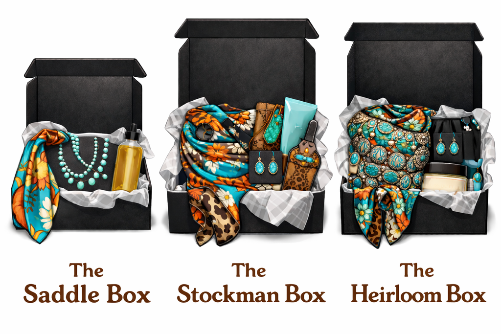 Our subscription boxes are a thoughtfully curated mix of western-inspired goods — jewelry, Wild Rags or Twillys, body items, and unique ranch-lifestyle pieces you won’t find bundled anywhere else.