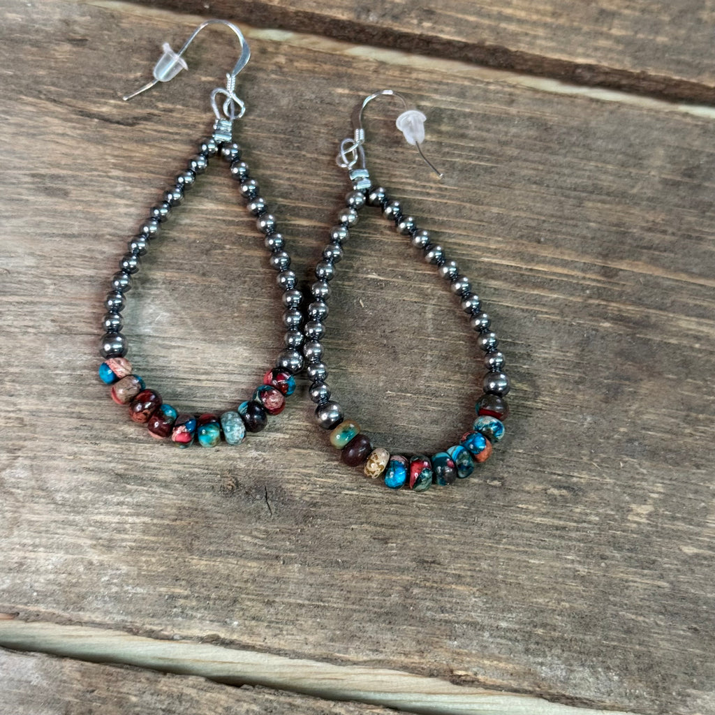 3.5" Tear Drops 3 mm pearls, diamond shaped turquoise. Sterling Silver hook.