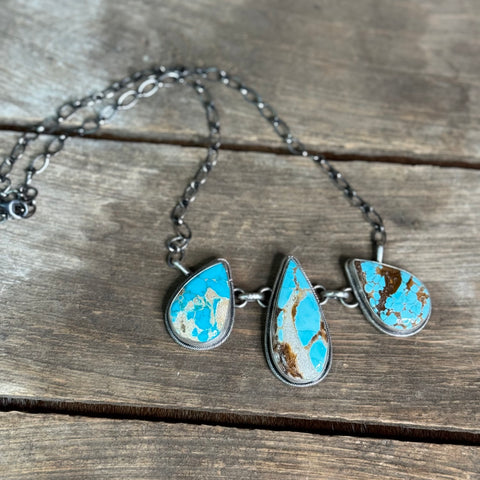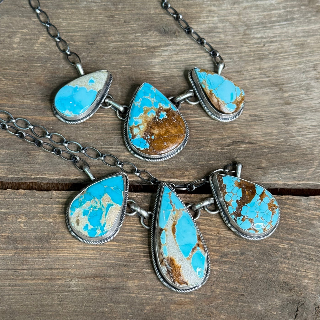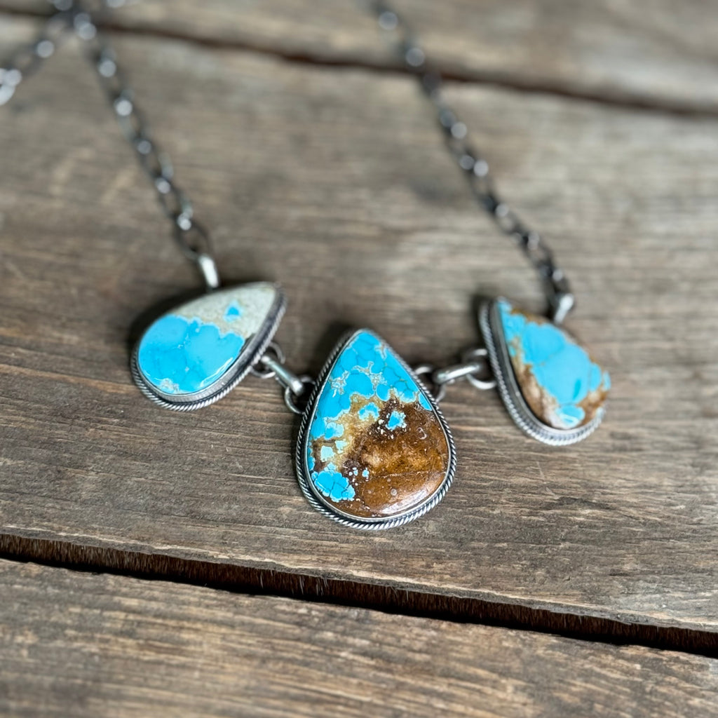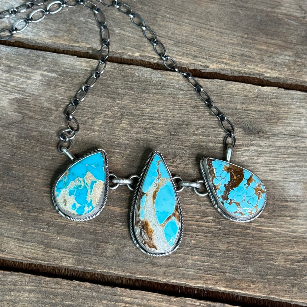 This Royston Three-Stone Statement Necklace features three genuine Royston turquoise stones set in sterling silver and arranged vertically in a bold, elongated design. The stacked composition creates strong presence while allowing each stone’s natural color and matrix to stand out.