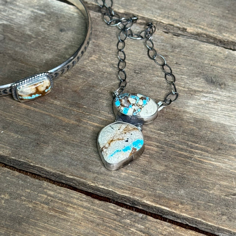 This Royston Ribbon Two-Stone Necklace features two genuine Royston turquoise stones set in sterling silver, stacked vertically in a flowing ribbon-style design. The double-stone layout creates a balanced statement—bold enough to stand alone, yet timeless and easy to layer.