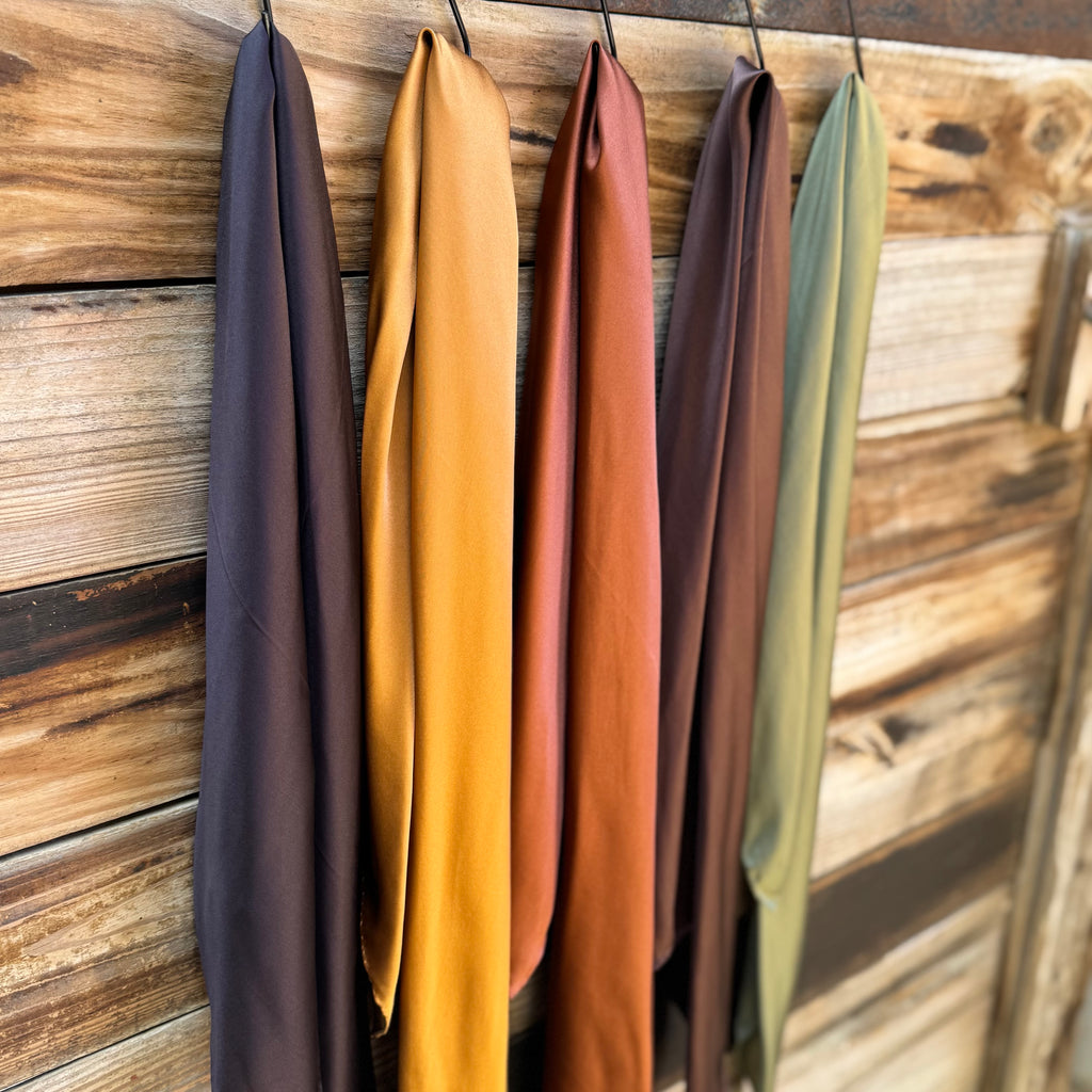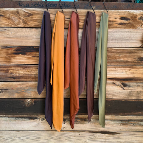 A classic cowboy scarf made from 100% silk satin. Designed for both function and style—warm, durable, and easy to dress up or down. Wear it at your neck, in your hair, or tied to your bag.