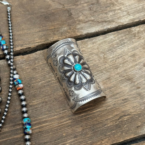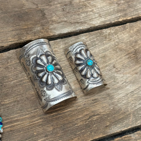 These handcrafted sterling silver hair cuffs feature intricate hand-stamped detailing and a bold turquoise stone centerpiece. Each cuff showcases traditional Southwestern artistry with a unique floral and scalloped design, making them the perfect accent to elevate your braid or ponytail. Available in two sizes, they offer both comfort and statement style for any occasion.